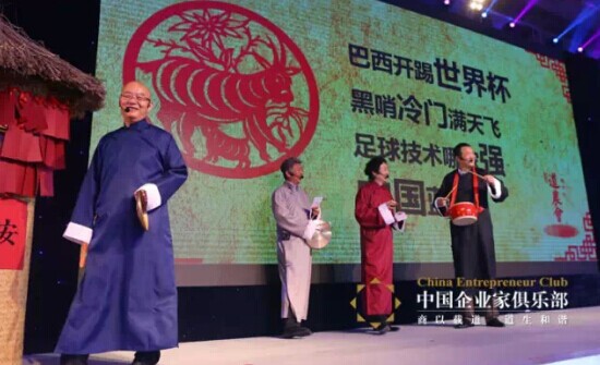 晚会在中国企业家俱乐部秘书长程虹和央视著名主持人张羽的联袂主持下拉开帷幕,“两会、世界杯、阿里万达IPO、国际化并购、企业周年庆……”,2014年的各种大事,通过企业家和跨界嘉宾们的说学逗唱等才艺,以轻松幽默、又温情向上的方式,让在场的嘉宾无不感觉到各种喜乐温情和麻辣酸爽。